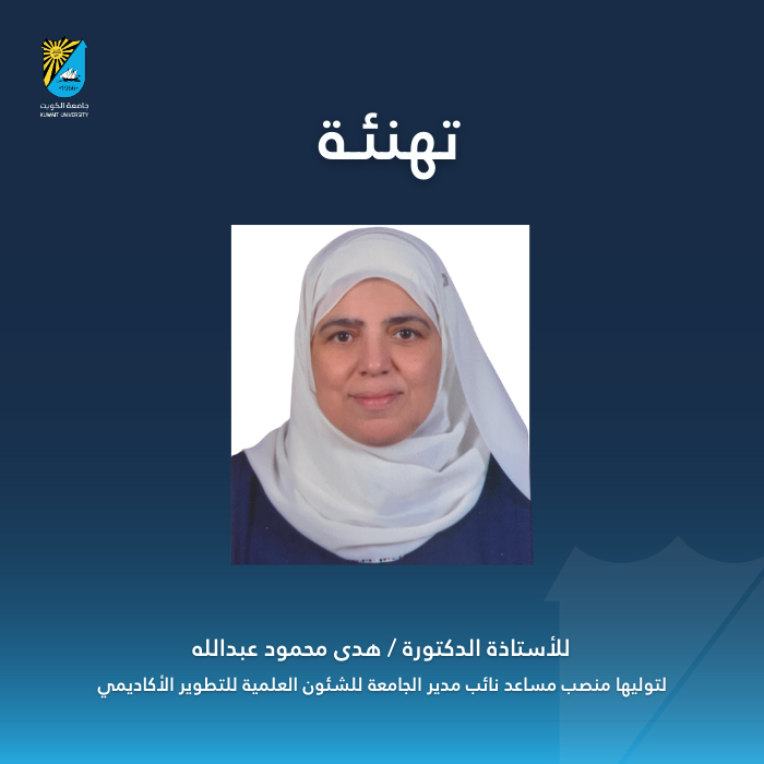 يتقدم قطاع الشئون العلمية بخالص التهاني والتبريكات للأستاذة الدكتورة / هدى محمود عبدالله محمود، بمناسبة توليها منصب مساعد نائب مدير الجامعة للشئون العلمية للتطوير الأكاديمي، سائلين المولى عز وجل أن يوفقها في مسيرتها المهنية، بما يعزز من مكانة القطاع العلمية و الأكاديمية في جامعة الكويت.